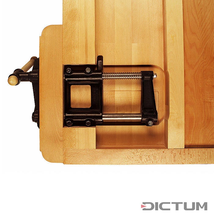 - Étau avant allemand massif 525 mm à guidages cylindriques, ouverture max. 140 mm, broche Ø 28 mm