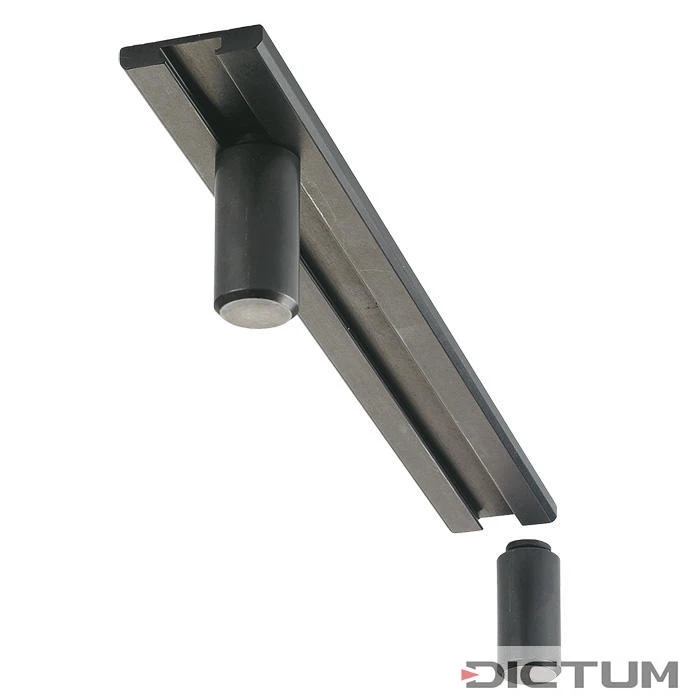 Butée d’aluminium pour la fixation de planches et de pièces plates sur la table d’établi. Grâce au positionnement de côté, pas besoin de valet de menuisier qui dépasse la surface de pièce. La surface peut être travaillée en entier. L’écart entre les deux tenons cylindriques est réglable par le biais d’une rainure en T à la partie inférieure de la butée. En utilisant plusieurs butées à planche il est possible de fixer la pièce de tous les côtés. Entre axes maximal des alésages 230 mm. Hauteur de butée 6 mm. Longueur 245 mm. Diamètre de queue 19 mm.