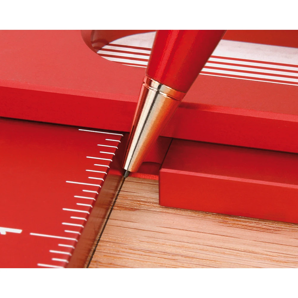 Cette équerre de précision de Woodpeckers est fabriquée en aluminium très rigide et donc très robuste. Grâce au procédé de fabrication spécial, la précision est de 0,01 mm sur 100 mm. Avec le doublage de poignée des deux côtés, l’équerre dispose d’une lèvre d’appui au niveau des surfaces de contact permettant un traçage confortable. Le trou oblong fraisé dans la lame du modèle 1281 offre une possibilité de préhension supplémentaire. Livrée avec support mural en MDF. Échelle en mm.
