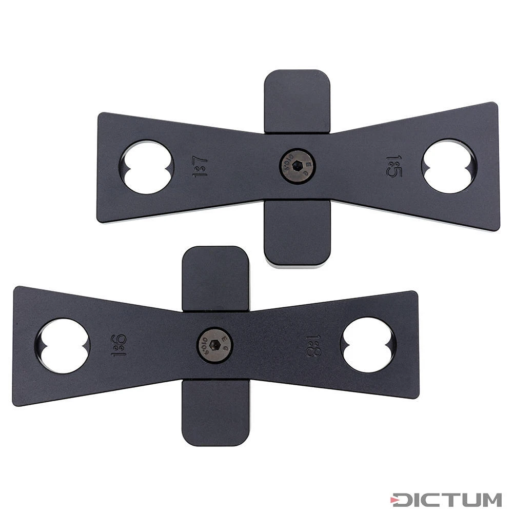 Gabarits d’angle avec quatre angles différents pour le taraudage de queues d’aronde. Les pointeurs intégrés permettent un positionnement précis sur les lignes centrales. Grâce à leur taille (120 x 60 mm) et à leur butée massive, les gabarits offrent une prise agréable. Convient aux épaisseurs de bois jusqu’à 45 mm, par exemple pour les assemblages de caissons ou de chevilles simples dans la fabrication de cadres et de montants. Rapport 1:5 et 1:6 pour le bois tendre, 1:7 et 1:8 pour le bois dur. En aluminium fraisé avec précision, anodisé noir.
