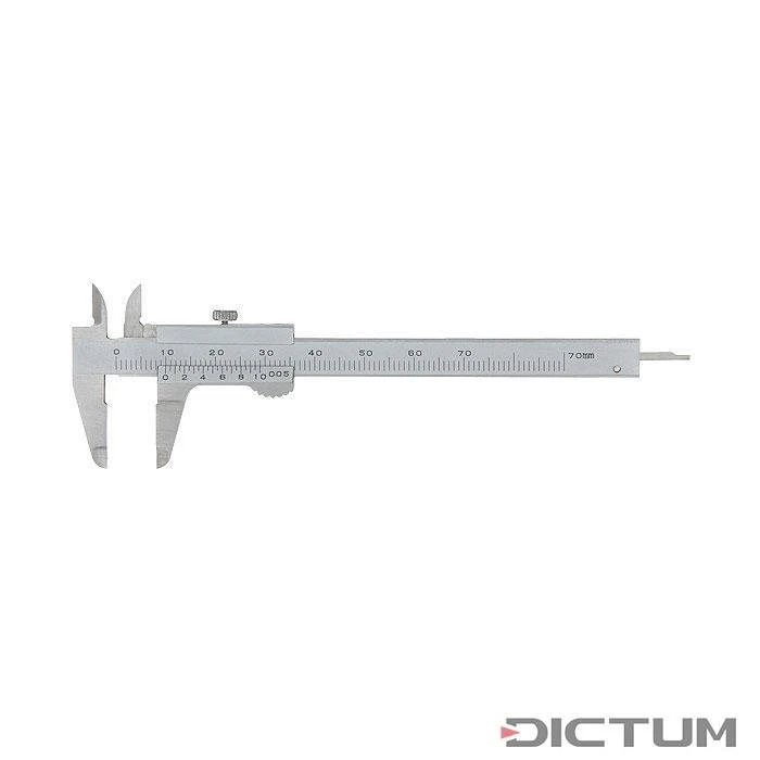 Pied à coulisse léger et compact pour la détermination des cotes intérieures et extérieures de petits ou fragiles objets, modèles, placages etc. Acier inoxydable, échelle à graduation profonde avec vernier 0,05 mm.